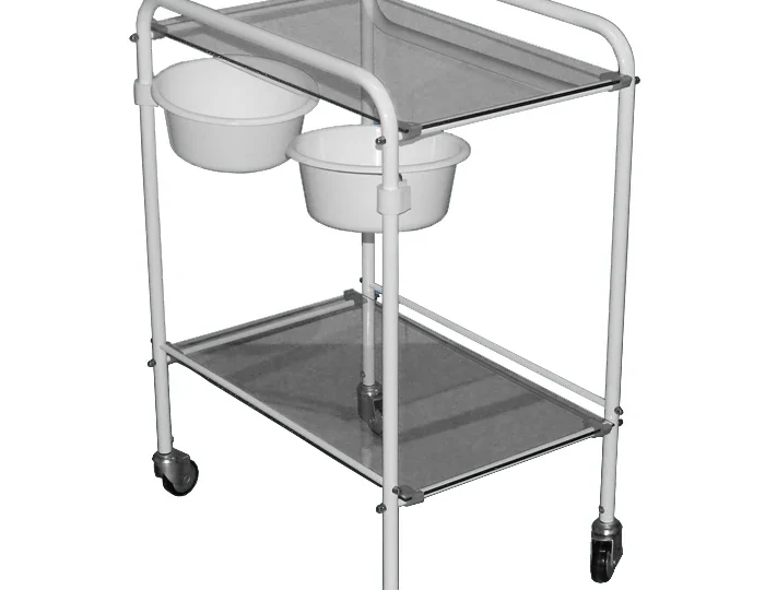 Model CRM z dwoma miskami to stolik zabiegowy o wysokim standardzie. Wykonany z wysokiej jakości metalu lakierowanego proszkowo. Dodatkowo, wyposażony jest w kółka, które ułatwiają jego przemieszczanie oraz 2 uchylne miski. Jest idealnym rozwiązaniem dla średnich i dużych klinik oraz szpitali.